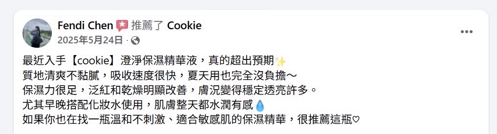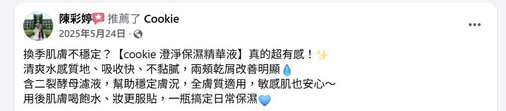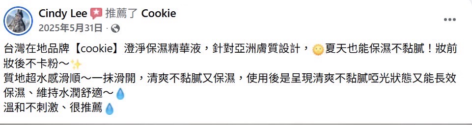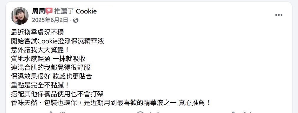Janet says: 一開始使用cookie時手邊還有其他專櫃精華液,抱持著嘗試看看的心態也不敢完全停用固定的產品,就變成早上使用專櫃品牌、晚上使用cookie來確認會不會因為不適合而致粉刺或是多長其他東西,用了三個月後發現完全沒有差別XDD 皮膚狀況還是很穩定,現在漸漸將專櫃的產品換成cookie 了😆😆 這款精華液也有淡淡的專屬香味,像是其他專櫃或開架產品一樣都有自己特別但好聞的味道,不過澄淨保濕精華特別是每一次打開都還是保有味道,不像是某些產品用久了,味道也漸淡。 推薦給喜歡清爽型的朋友,連男生也很適合唷,手中這罐目前已成為男友早晚化妝水後必須的保養品🤣 30 7 月, 2025 at 8:01 上午 回覆